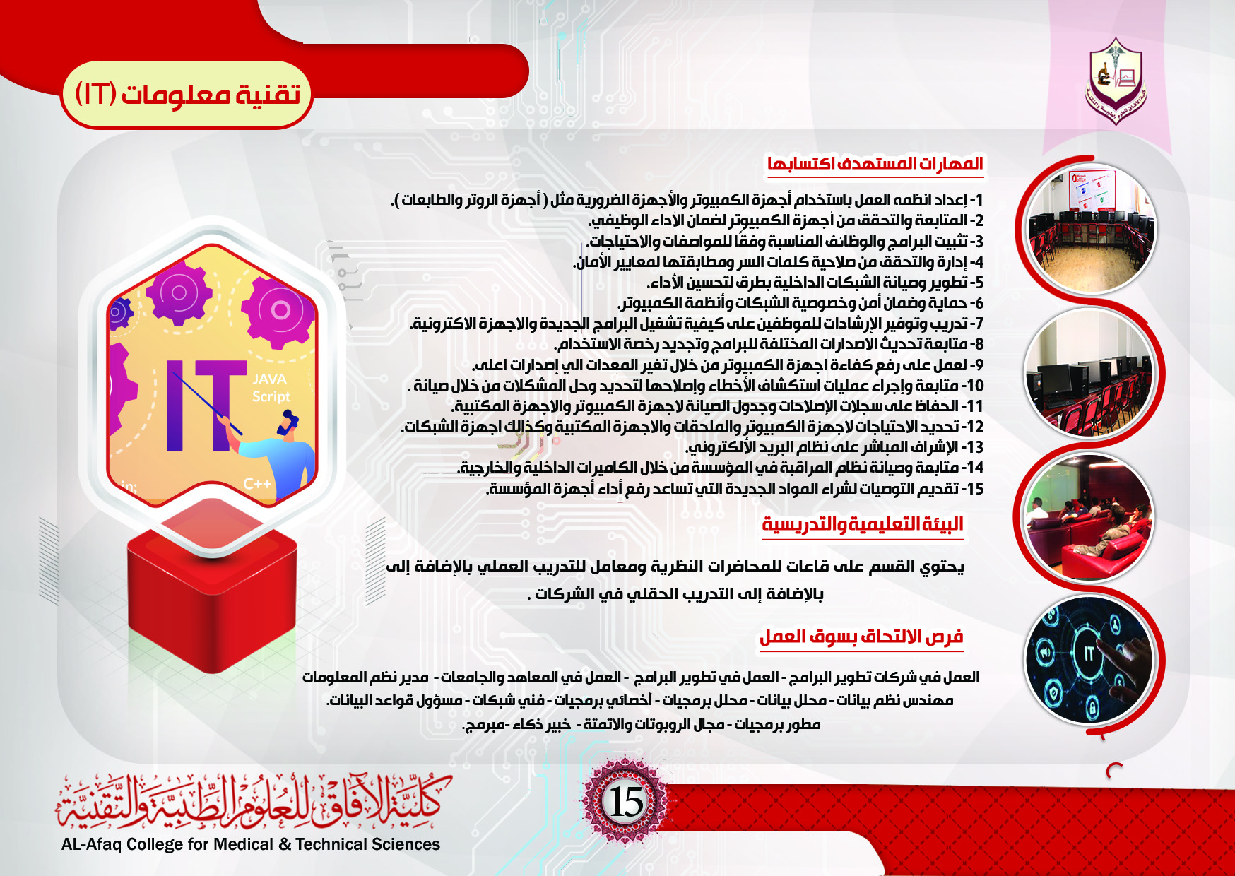 1- تأهيل الكوادر العلمية المتخصصة في مجال تقنية المعلومات والعلوم الأخرى ذات الصلة كعلوم البرمجيات وشبكات الحاسوب والانترنت وغيرها من التقدم الحديث في التكنولوجيا.