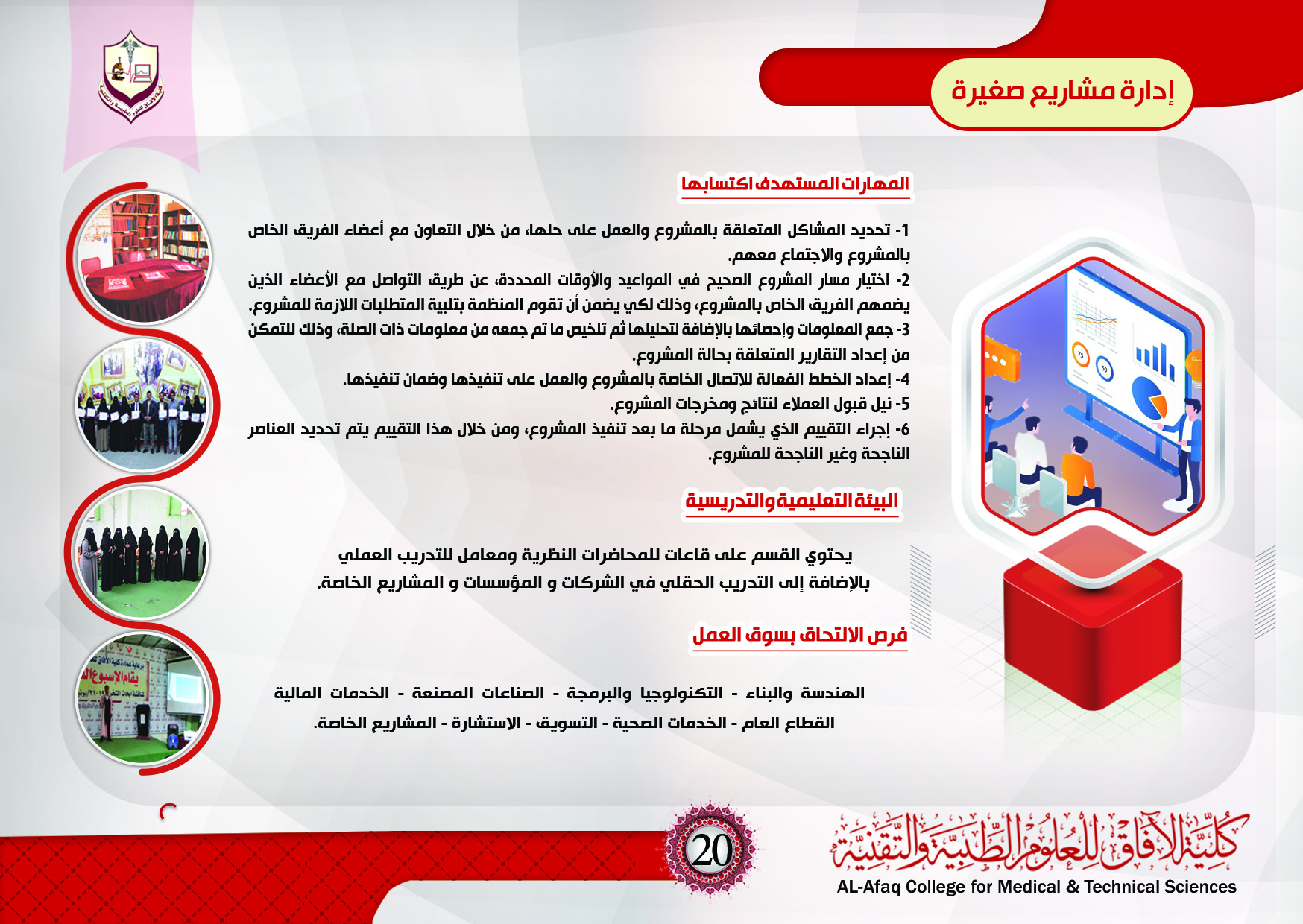 إعداد خريجين مؤهلين أكاديمياً ومتخصصين في مجال إدارة المشاريع الصغيرة من خلال توفير بيئة تعليمية متكاملة ودعم وتشجيع البحث العلمي والشراكة الفاعلة مع مؤسسات المجتمع المحلي، وتعزيز علاقات التعاون مع فعاليات الأعمال.
