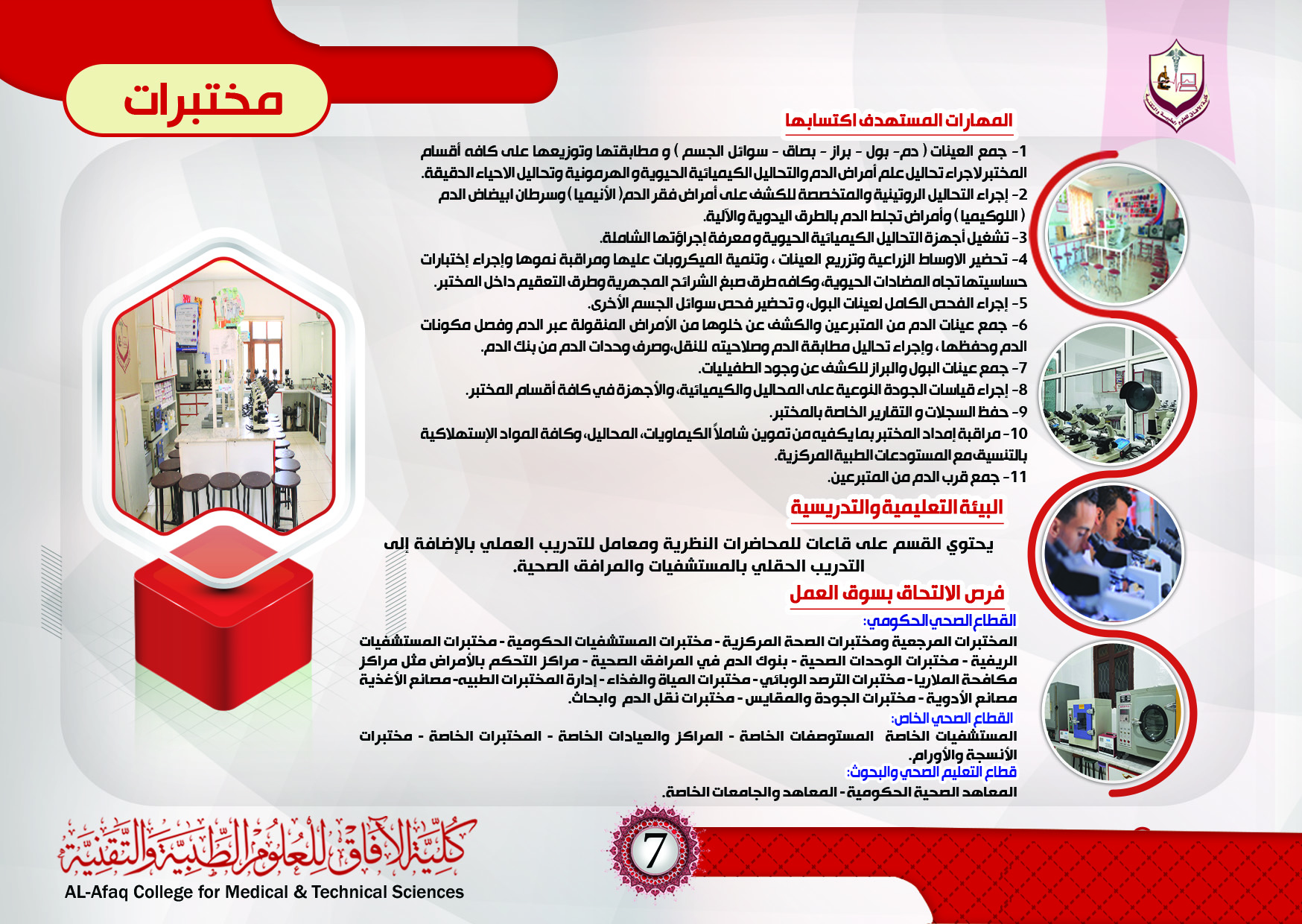 تقديم التعليم الأكاديمي والتدريب المخبري الطبي المتميز للطلاب والطالبات في مجال المختبرات الطبية وغرس القيم الإسلامية والأخلاقية التي تصقل مهارات الخريجين والخريجات المؤهلين والمطابقة للمعايير العالمية.